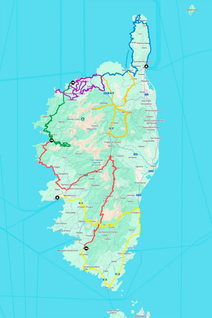 Les villes où nous nous arrêtons sont Ajaccio, Bastia, Saint-Florent, L’Ile Rousse, Calvi, Porto-Ota, Sartène, Corte, Bonifacio, Porto-Vecchio, …
